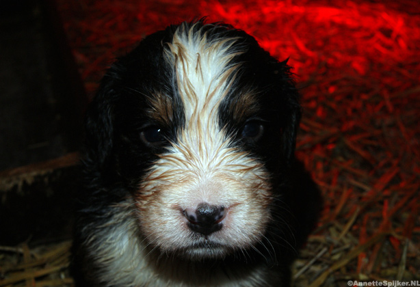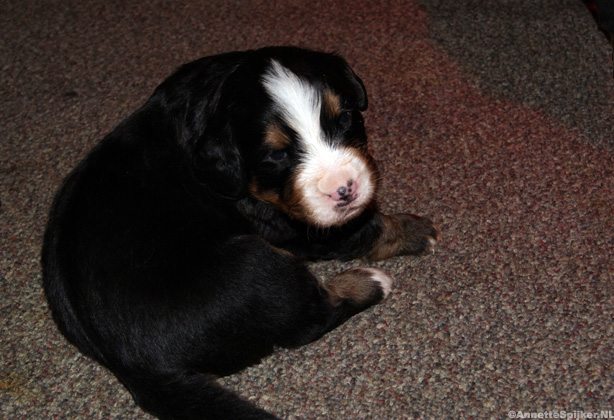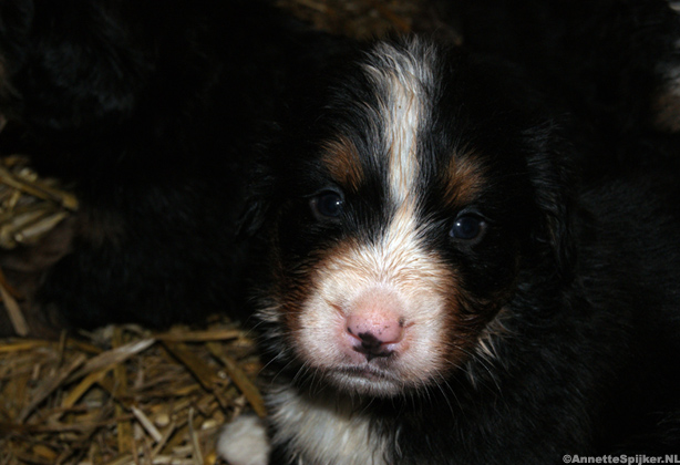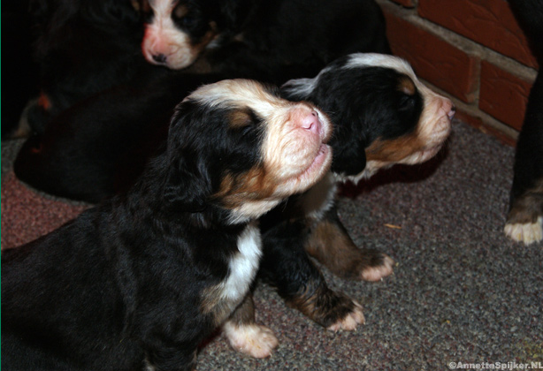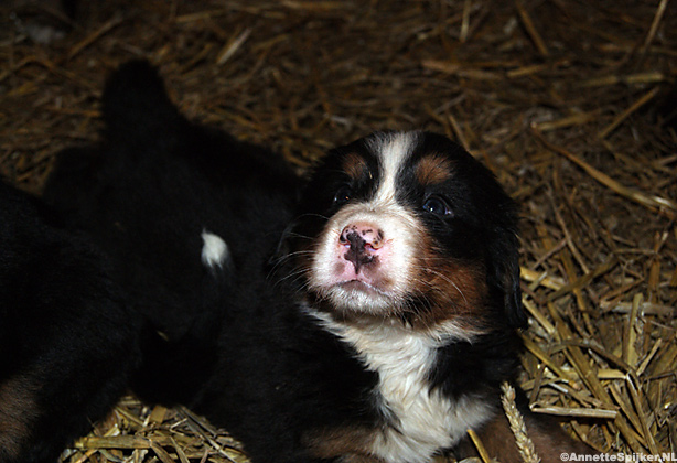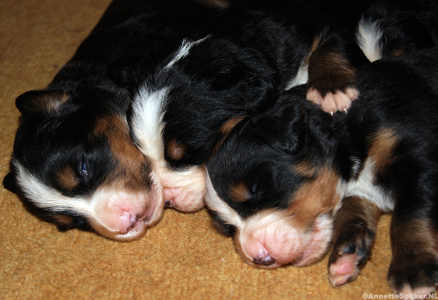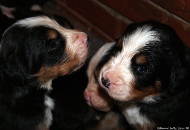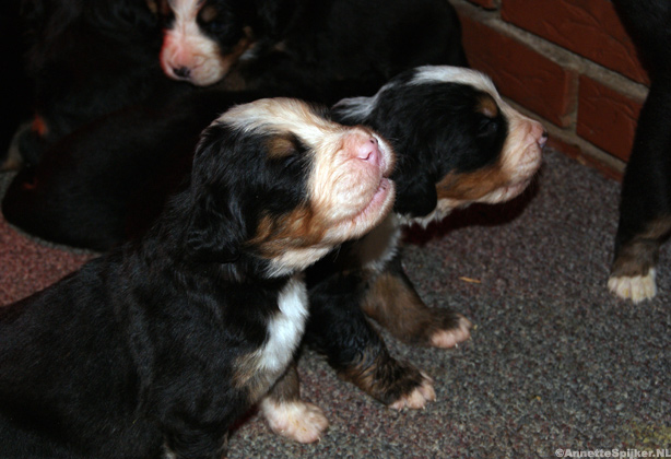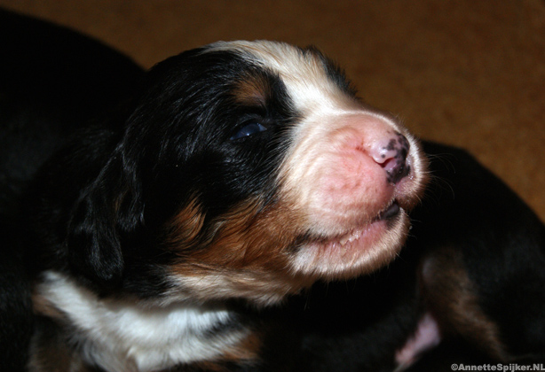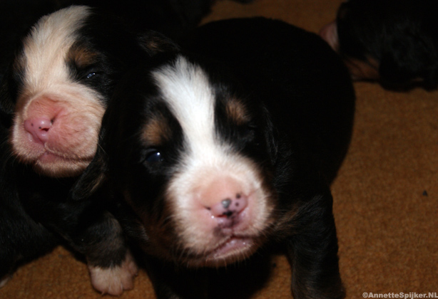 Op de foto’s zijn de pups één week oud. Het is zo mooi; alles zit erop en eraan en de specifieke tekening van de Berner Sennen is al helemaal te zien.